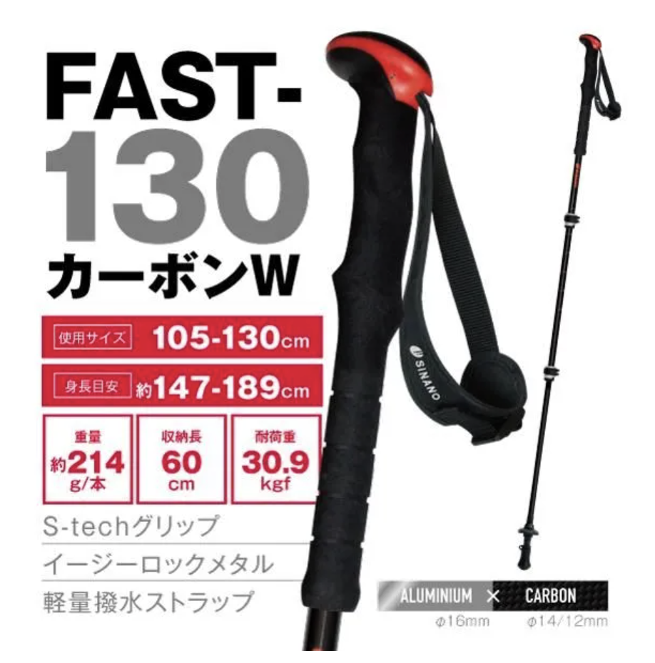 SINANOの「FAST-130 カーボンW」は、上段に超軽量アルミを、中下段にカーボンを採用することで、振りやすさを追求した登山用ストック(ユニセックス)です。重心を手元に近づけることで、軽い力でコントロールできます。
