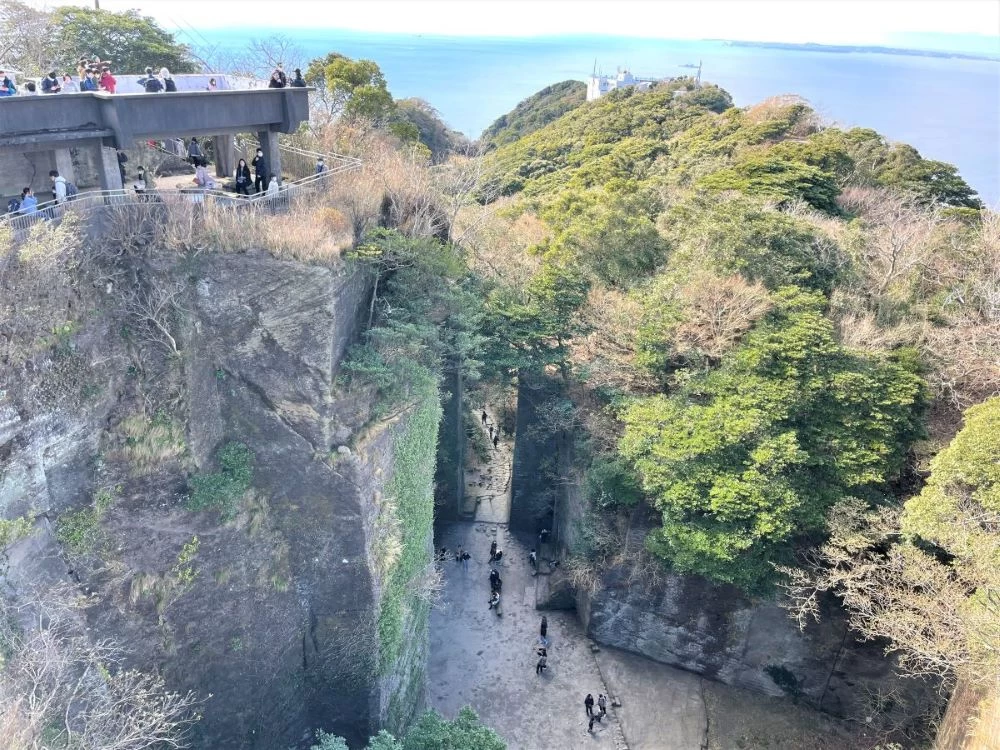 崖から突き出ている地獄のぞきでは、傾斜した崖の先端に向かって下るとその先端から下をのぞくことができます。手すりはついているものの、谷底の景色はスリル満点です。