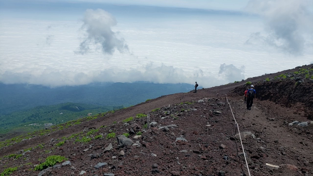 七合目(標高2,700m)になると、平地より-16℃となります。麓の気温が30℃あっても、七合目では14℃となるため、しっかり寒さ対策をしておかないと冷えに悩まされることになります。実際、10月でも七合目辺りまで雪が残っていたケースもあるようです。