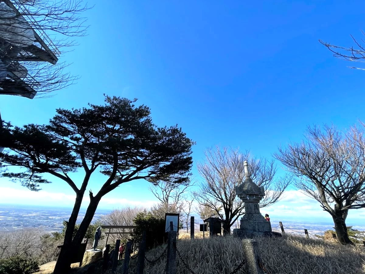 なお、晴れていれば遠方に富士山の姿も望めます。また、山頂手前には県指定文化財の一つであり、八つの功徳があると言われる石造宝篋印塔もあります。