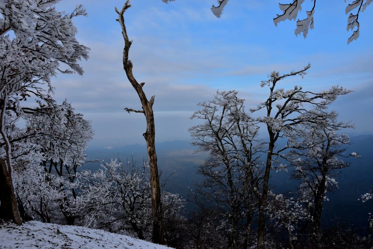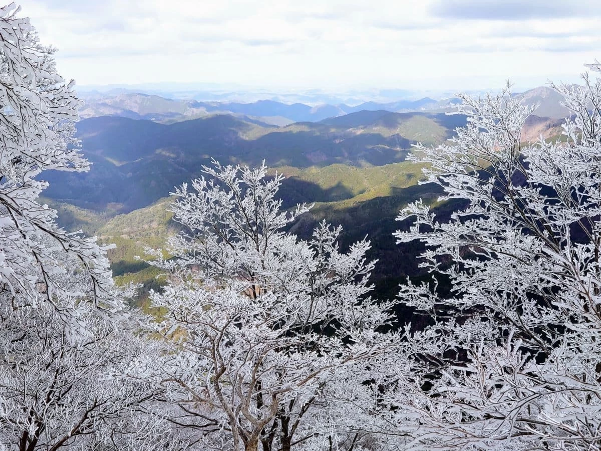 日本三百名山のひとつにも選ばれており、四季折々の豊かな自然をたのしめる山として一年を通して登山客が訪れる人気の山です。特に冬になるとブナ林が霧氷で覆われて幻想的な風景を作り出すことで知られており、本格的な雪山装備がなくても気軽に雪山ハイキングをたのしむことができます。高見山は霊峰としても有名で、山頂には八咫烏を祭る高角神社(たかすみじんじゃ)があります。