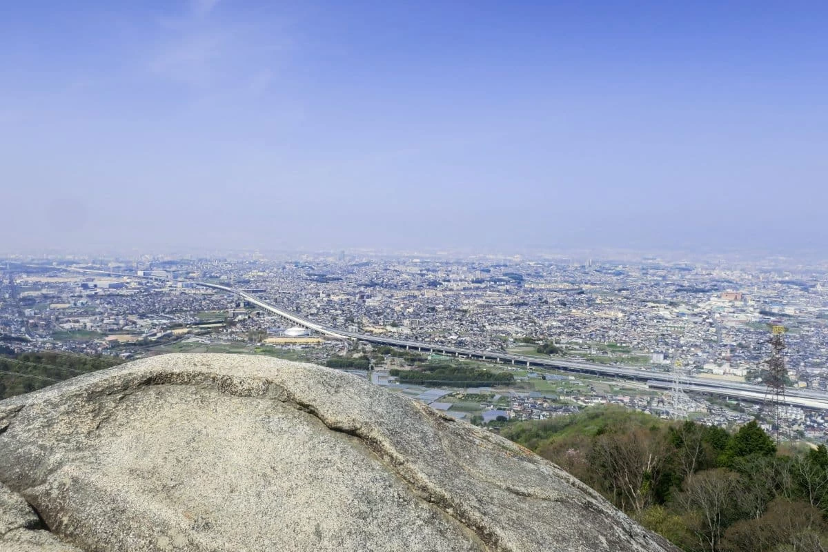交野山(こうのさん)は大阪市交野市に位置する標高341mの低山です。生駒山地の北部を形成しており、その名の通り交野市のシンボル的な山です。古くより巨石信仰と修験者の霊場とされており、山頂には観音岩という巨大な岩があります。岩の上からは大阪府と京都府を一望する絶景を望むことができます。初心者向けの山として知られていて、気軽なハイキングスポットとして多くの人に親しまれています。