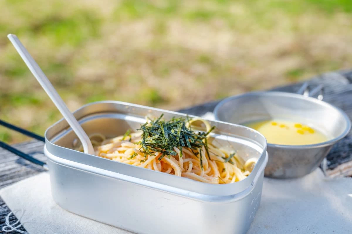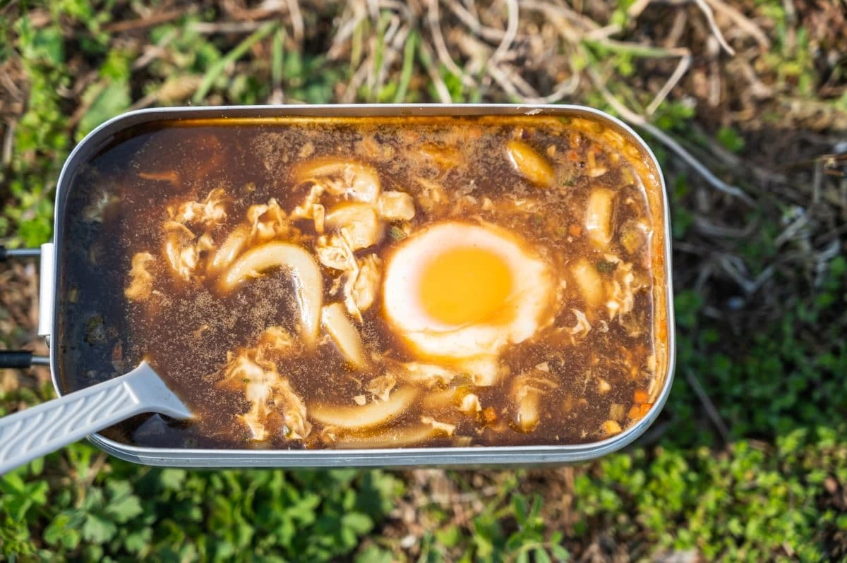 洗い物がメスティンだけであり、調理から片付けまで少ない時間と手間で抑えられる点が魅力のメニューです。湯切りする必要はなく、登山時の調理に適しています。
