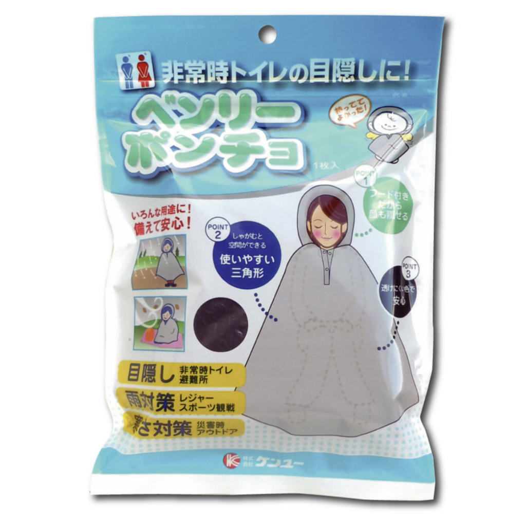 「ベンリーポンチョ」は、株式会社ケンユーが提供している目隠しです。排泄時の姿をポンチョで隠せることから、携帯トイレと併用することをおすすめします。フードが付いており、顔も隠せる点も嬉しいポイントです。